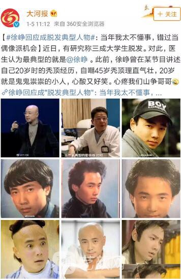 原來是有研究稱“三成大學生脫發(fā)”,對此,醫(yī)生認為大學生脫發(fā)情況很多,并@徐崢說是較典型的,之后徐崢便回應: